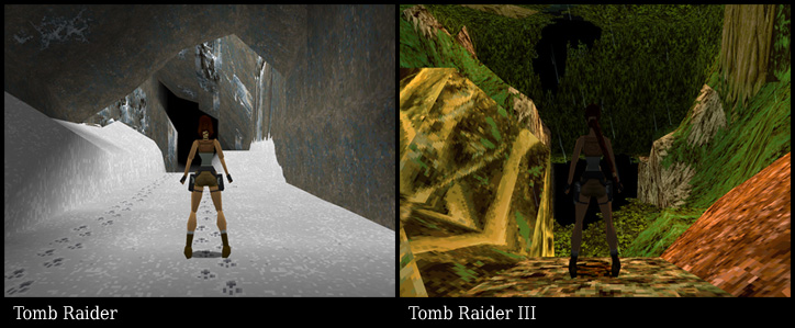 While taking screenshots of Playstation games for my emulator front end, I noticed something interesting in the Tomb Raider series. Shown here is a side by side comparison of the first moment of gameplay from Tomb Raider and Tomb Raider III. Both games use the same engine and have virtually identical graphical capability, yet TR1 looks much better.
